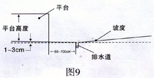有坡度的泊車區應設計完善的排水設施。排水區位于平臺前,從平臺墻壁向外應有稍許坡度(2-3CM),距離排水道應有0.5至1米(圖9)。排水區不能太寬,以減少貨車后軸位置影響貨車車廂與平臺之間的高度差。